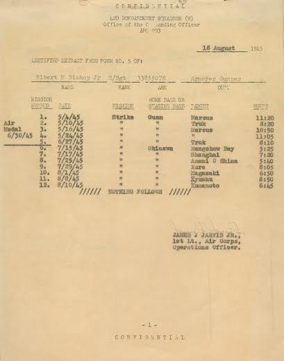 Bishop and the other nine members of “Betty-J” made 12 combat missions on Japanese-held Pacific islands and eventually the Japanese home islands. Their first flight was on May 4, 1945. They bombed Marcus Island, an 11-hour and 20-minute mission, which was their longest.