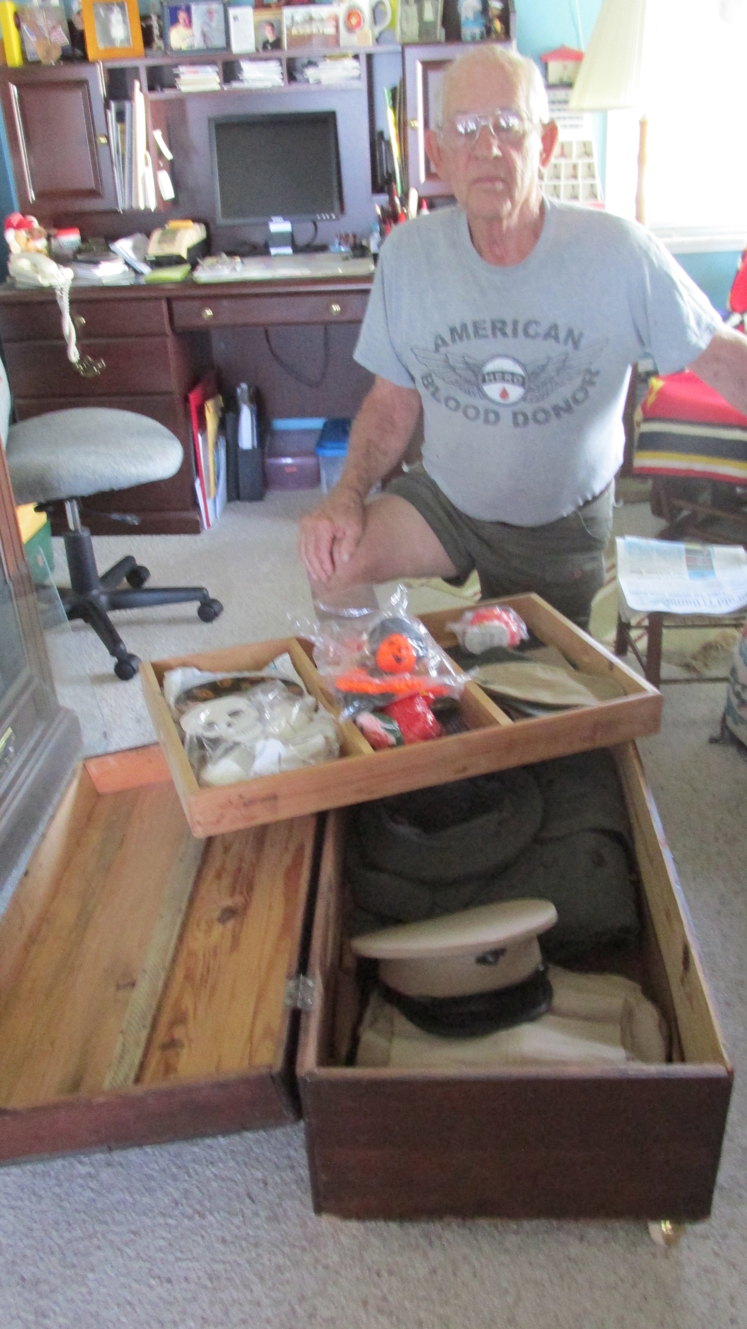 Cote at home with a wooden foot locker he had made for him in Korea. On the lid of the locker it reads: “Lawrence R. Cote, Korea 1952-53” in old English type in gold. Sun Photo by Don Moore