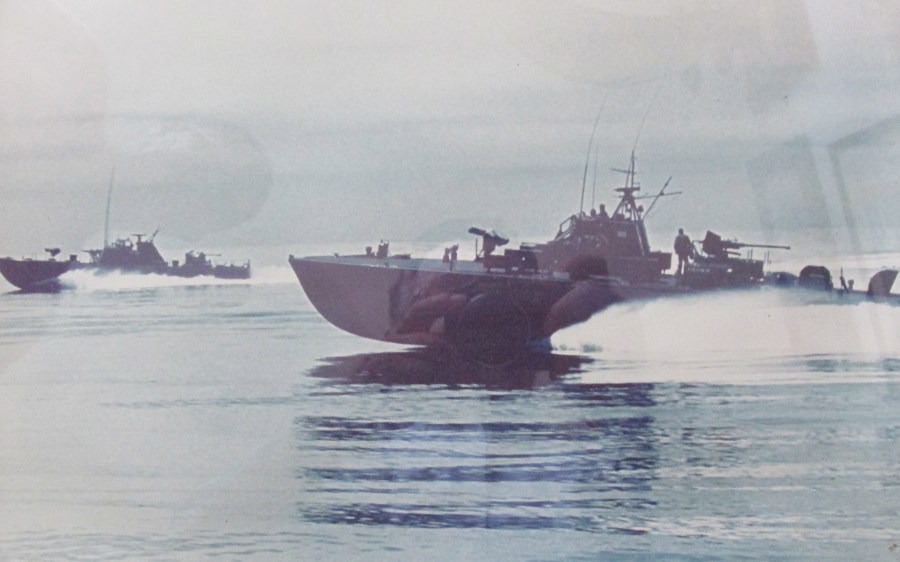 In the foreground is an 85-foot “Trumpy Class” PTF boat used on the rivers in Vietnam during the war. It was a double-hulled, mahogany craft with twin 3200 hp engines like one Berree skippered after the war. In the background is a aluminum 95-foot “Osprey Class” patrol boat. Photo provided