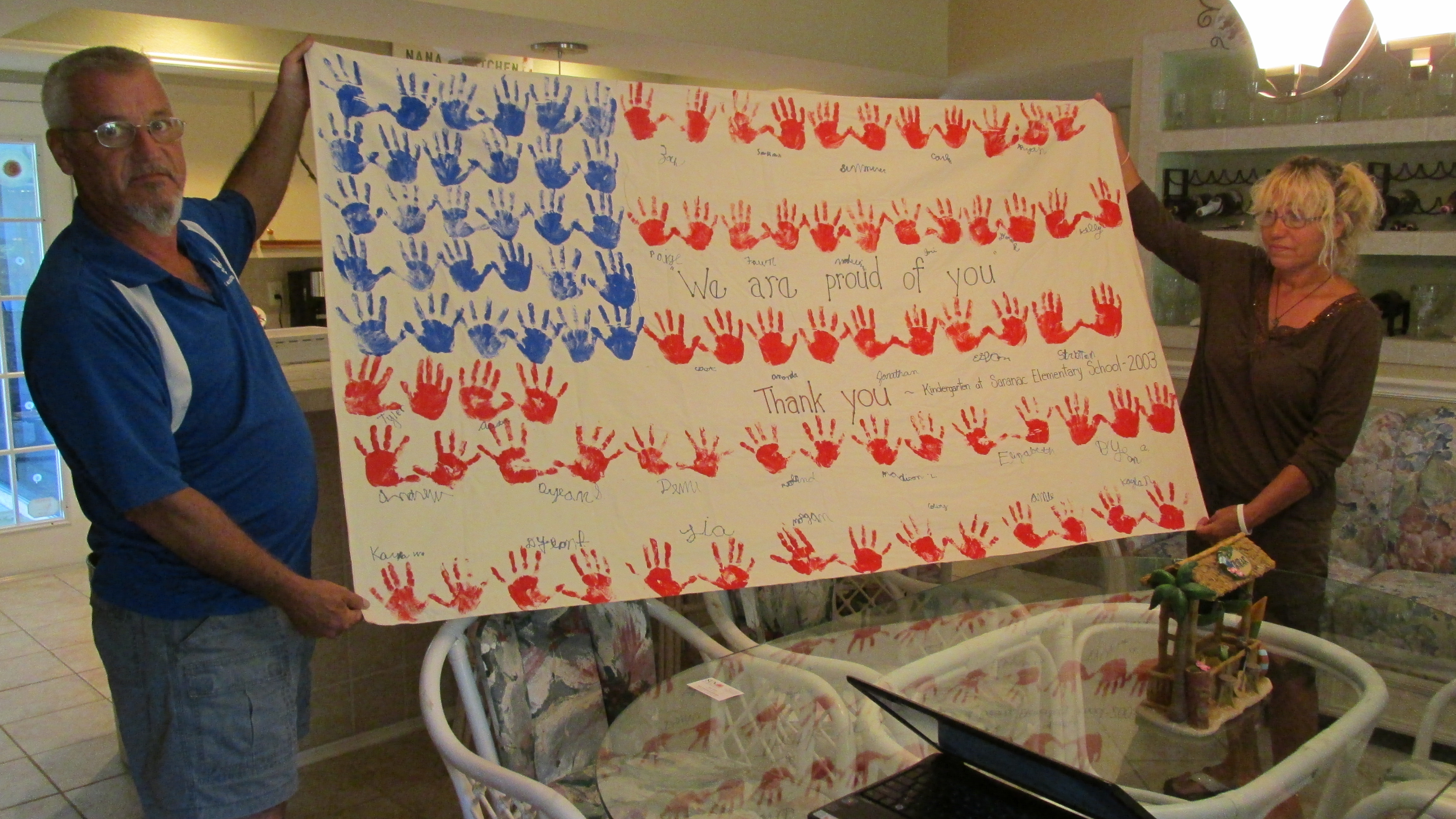 Former Sgt. Klein and his wife, Sharon, hold a banner a group of grade-school kids made for him at a school in Plattsburgh, Ny., where he was stationed at a SAC base for years. The flag went with him to Iraq in 2006 and 2007. Sun photo by Don Moore