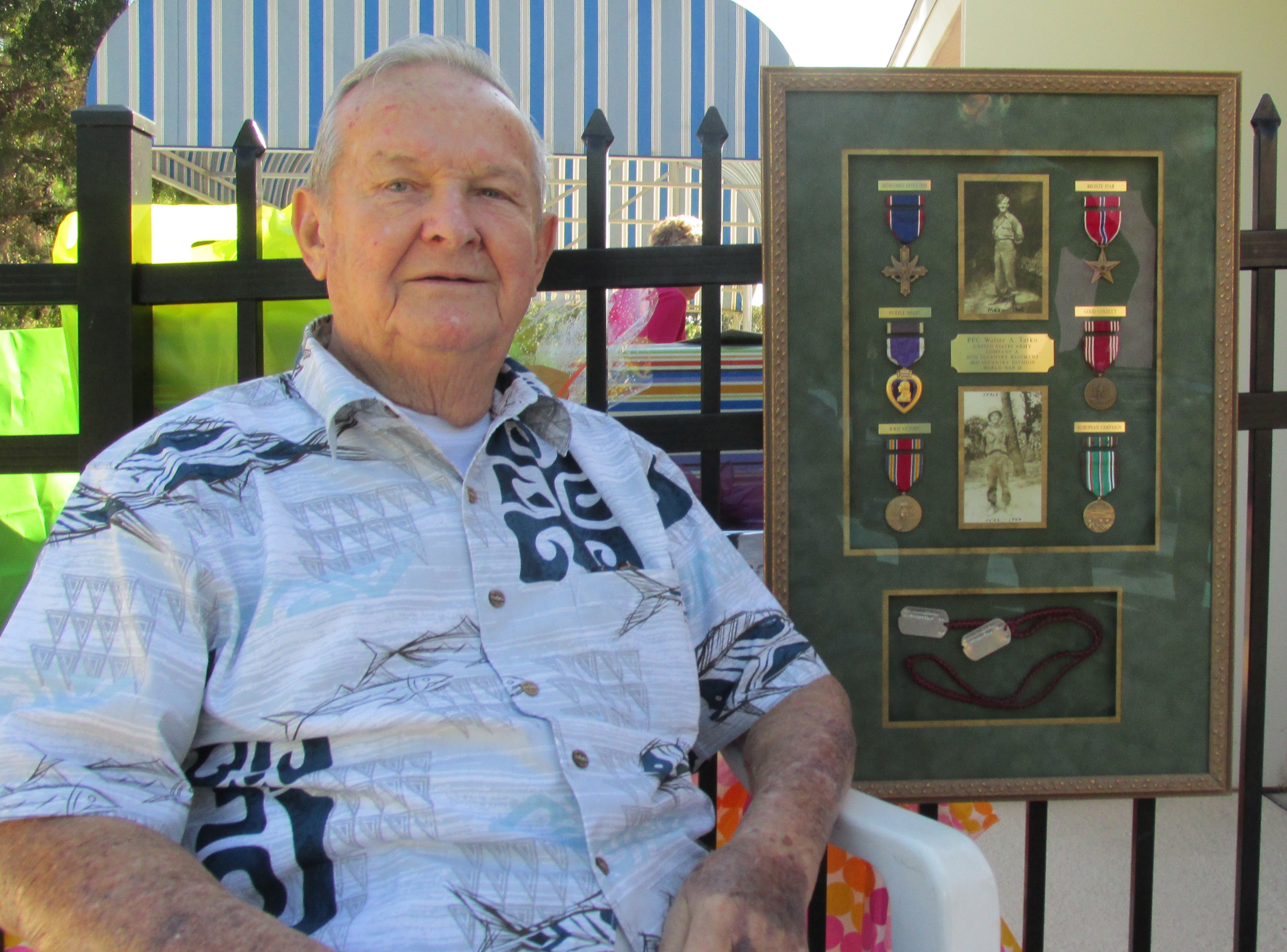 Tatko at 90 at his home in Venice, Fla. with a shadow box full of medals including the DSC and the Purple Heart. Photo provided
