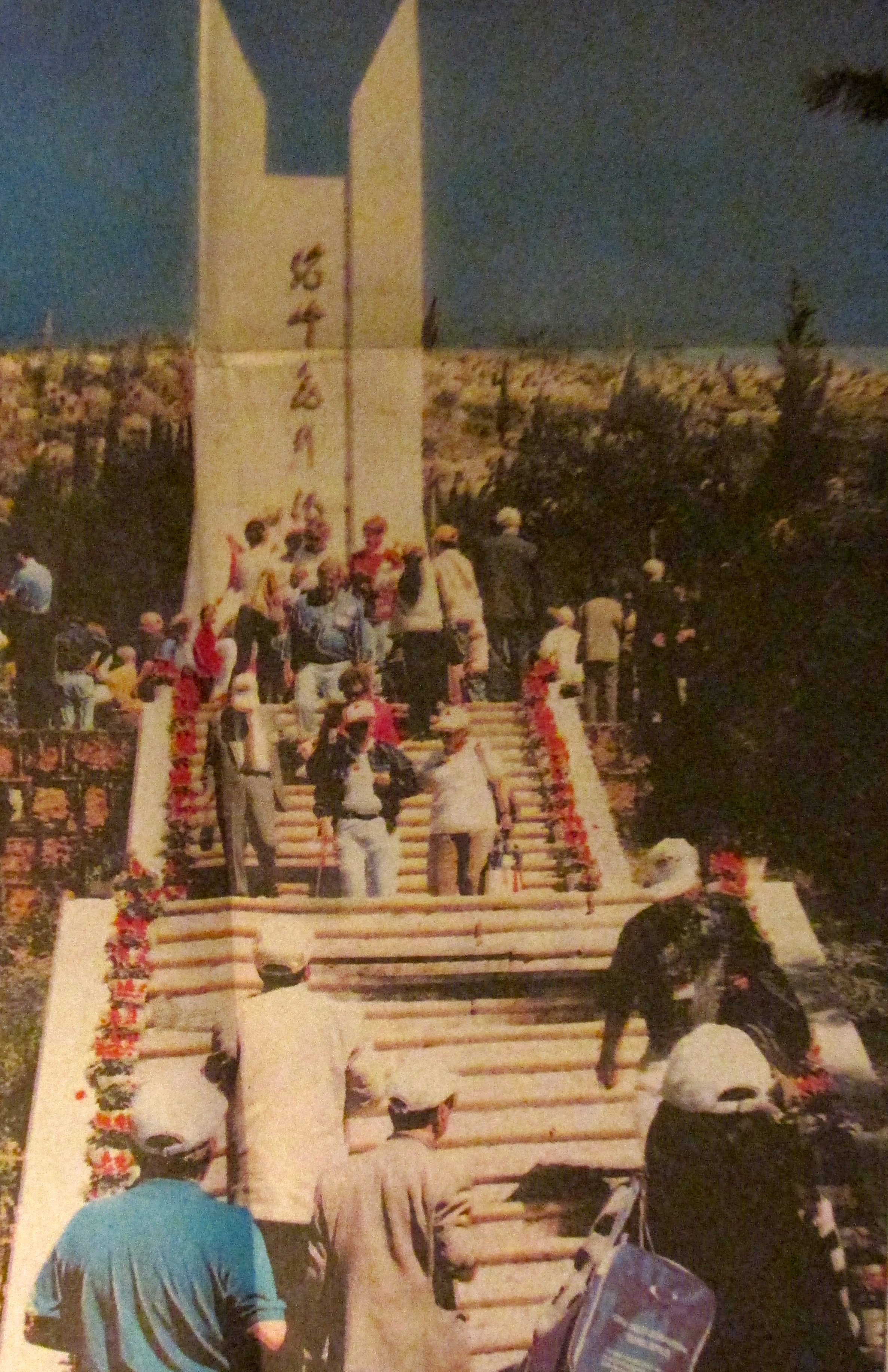 Members of the American 14th Air Corps who flew “The Hump” between India and Burma during World War II, support troops and their relatives just returned from China in commemoration of their feat fifty-five years ago. Here they are at “The Hump” Memorial in Kumning. Photo by Bob Friedman