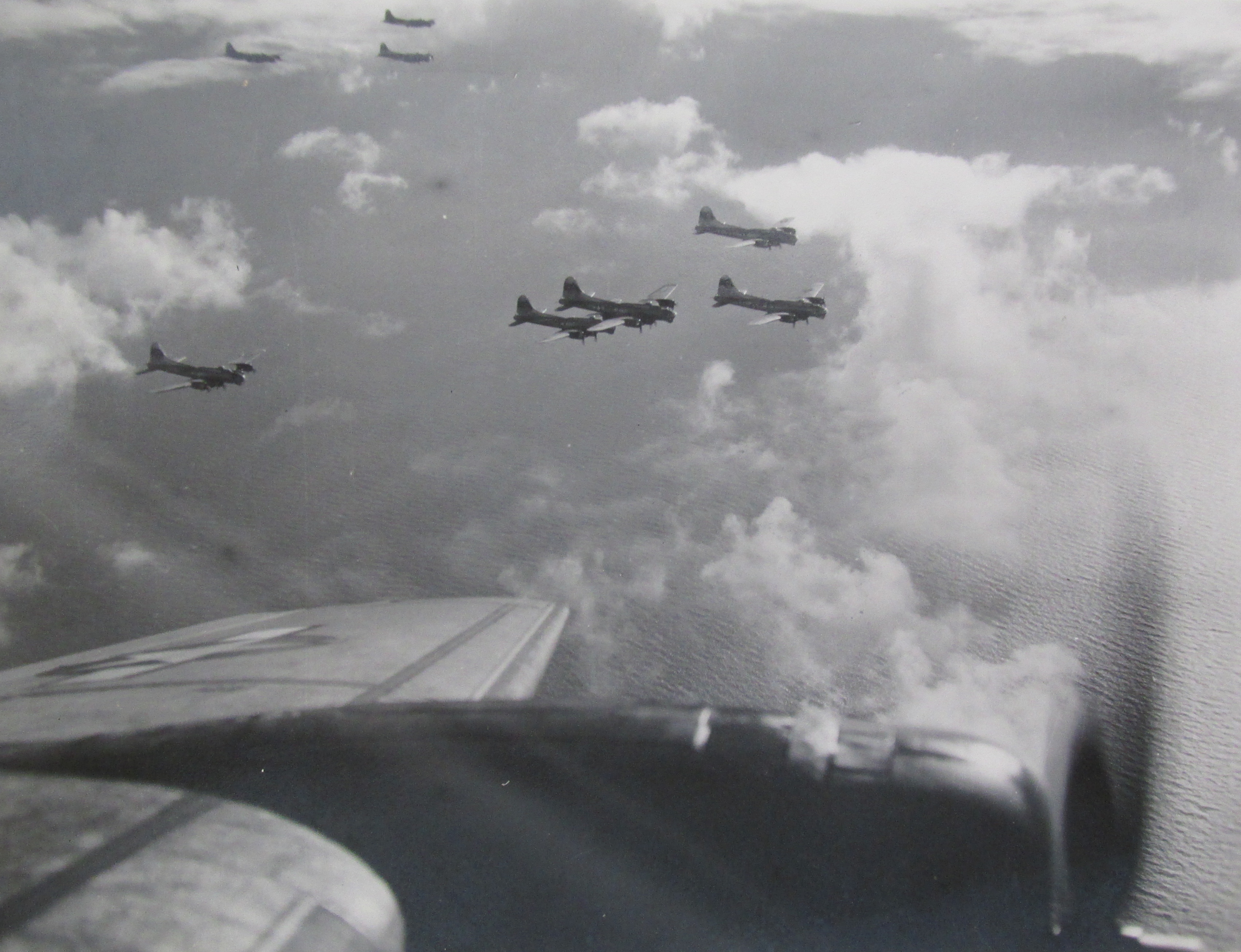 This picture was taken from Tristano's bomber showing a flight of B-17s on a combat mission to bomb Germany during World War II. Photo provided