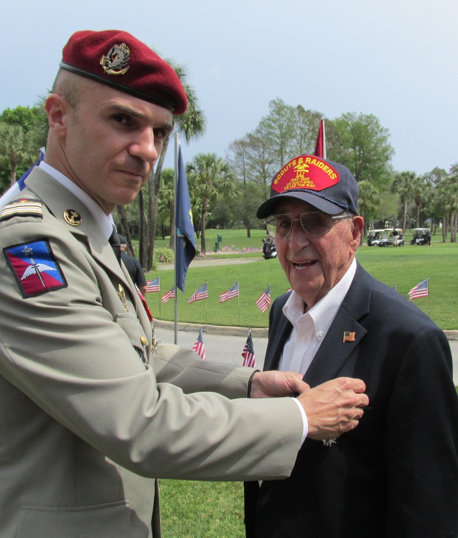 The diminutive 93-year-old former sailor stood ramrod straight as Lt. Col. Stephane Cutajar pinned the elaborate five-pointed white and green enameled award suspended by a blood-red ribbon on the pocket of his blue blazer. The colonel is a liaison officer at Mac Dill Air Force Base in Tampa who represented the French government at the ceremony,
