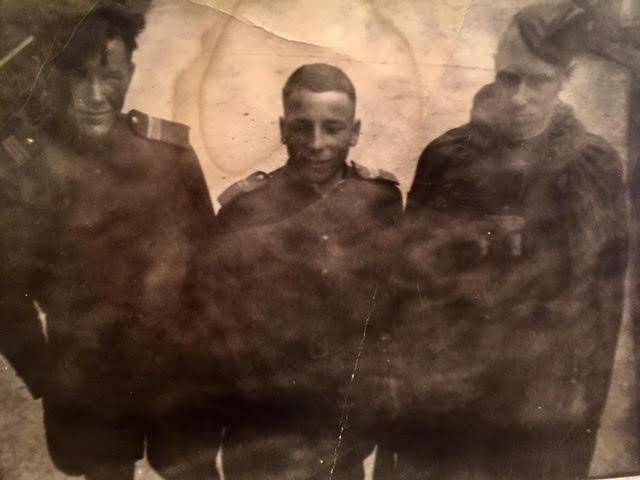 What’s left of a damaged picture showing three Russian soldiers at a USO party in the American Sector. More than 70 years after the party Scaruffi vividly recalls that the Russians weren’t very friendly. Photo provided