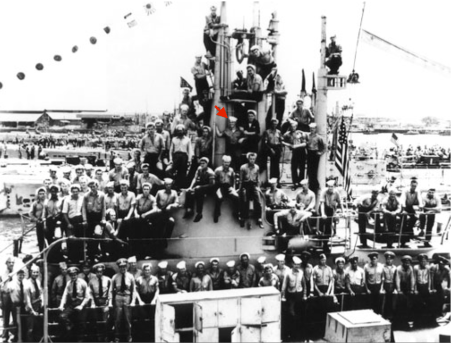 This victorious homecoming picture of the crew of the submarine USS Bowfin (SS-287) was taken at the sub’s home base in Guam on July 4, 1944. The crew had just returned from a successful raid on Japanese shipping in the Sea of Japan. Alf is standing near sub’s mast in the middle of the picture. Note the arrow pointing to him. Photo provided