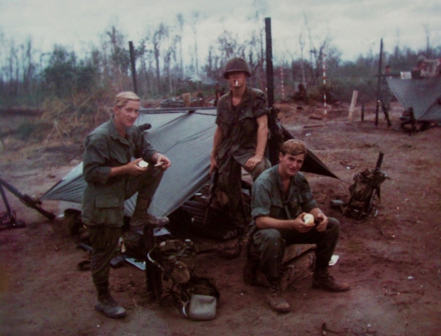 Folden is squatting down eating an apple. On the left is Curtis Sharp {standing and also eating an apple) who was killed when their mortar squad was over-run on Dec. 9, 1968 at the rubber plantation in Vietnam. He was due to go home the next week. Photo provided